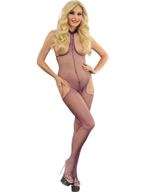 Фиолетовый кэтсьюит с вырезами на груди, бёдрах и в шагу.