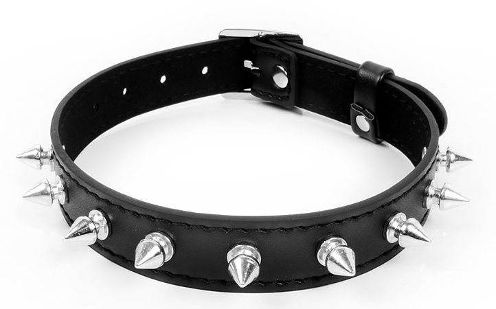 Оригинальный ошейник для любителей БДСМ-игр, декорированный металлическими украшениями. Имеет возможность регулировки размера с помощью ремешков. БДСМ-аксессуар прост в применении, не требуют специального ухода.