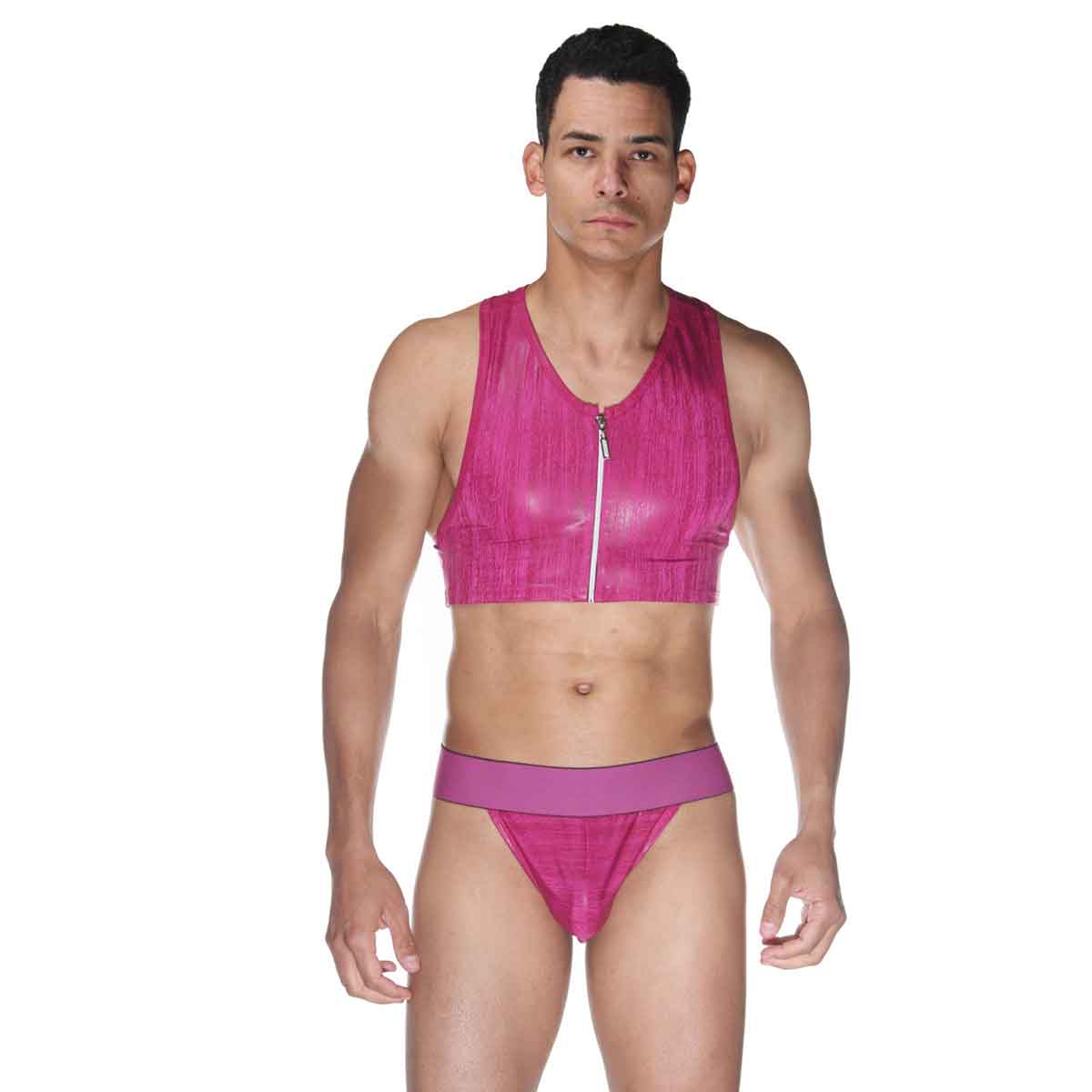 Комплект для мужчин, состоящий из топа на серебристой молнии, и трусов-тонгов на очень широкой резинке. Комплект из мягкой, гладкой и блестящей ткани. В комплекте: топ, трусы.