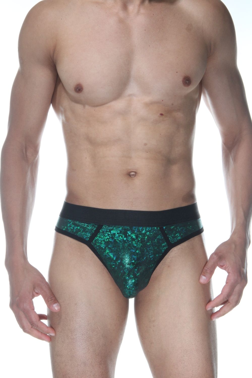 Зеленые блестящие мужские трусы-стринги.