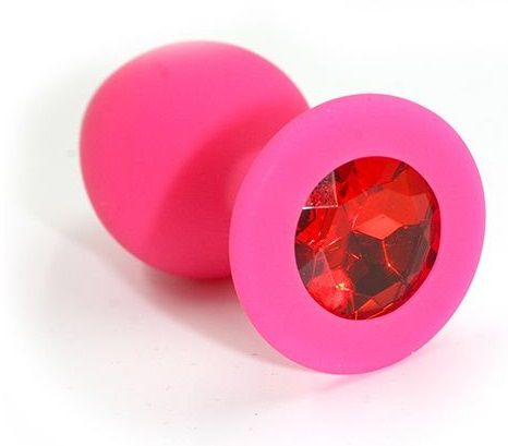 Анальная пробка из силикона розового цвета, размер M. Страз в основании круглой формы, выполнен из стекла красного цвета. Упакована в вельветовый мешочек для хранения. Вес - 46,5 граммов.